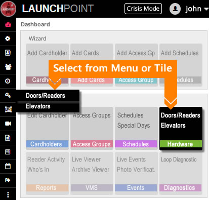 Dashboard: select 'Hardware' Tile (under Configure section) and select Elevators.
