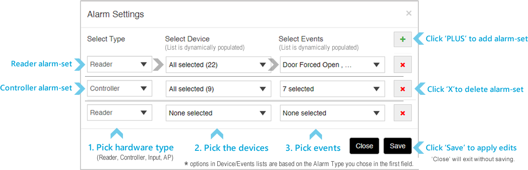 Reader Events = "check" the specific reader/door events - [e.g. Door Forced, Invalid Access, etc. ]