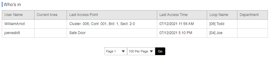 The Who's In Report is a real-time snapshot of the List of Cardholders that are "in" a designated area (or that meet a specific criteria set by the user) when the report is queried.